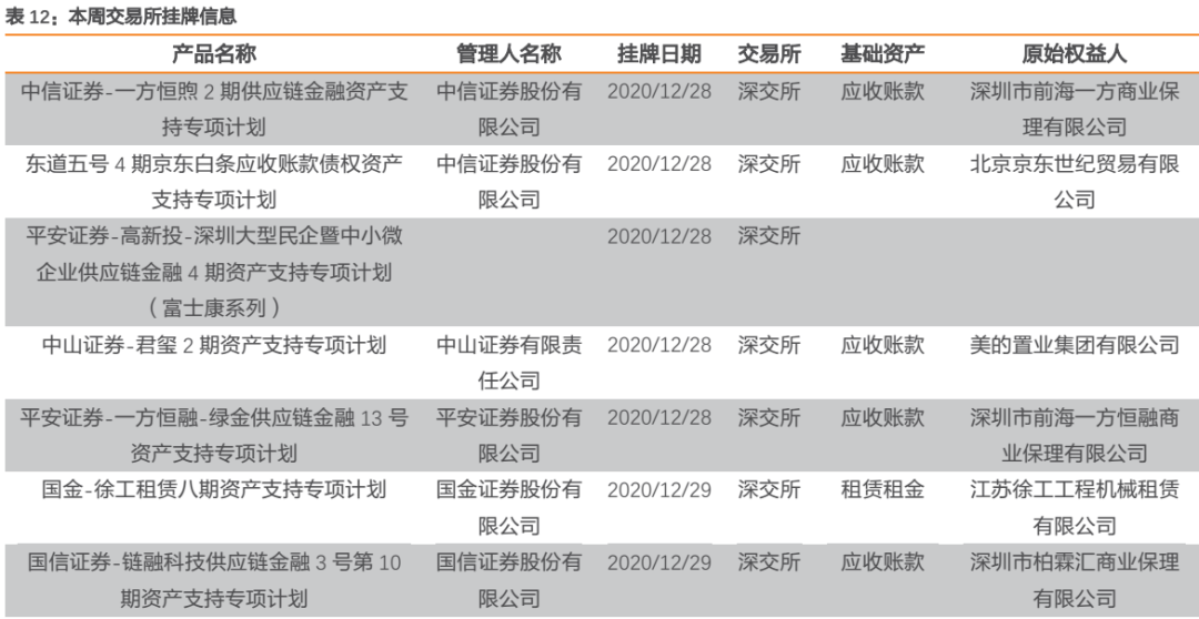 本周有15期资产支持专项计划在交易所挂牌,均在深交所挂牌,本次挂牌转让产品中,基础资产包括应收账款、企业债权、租赁租金等。