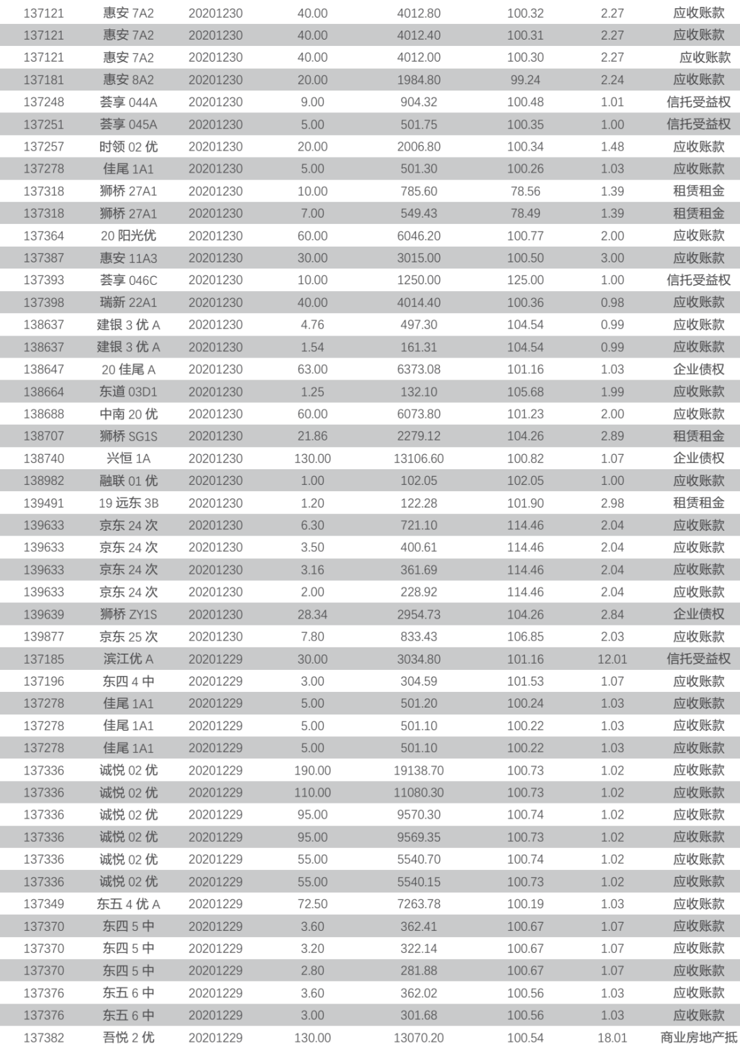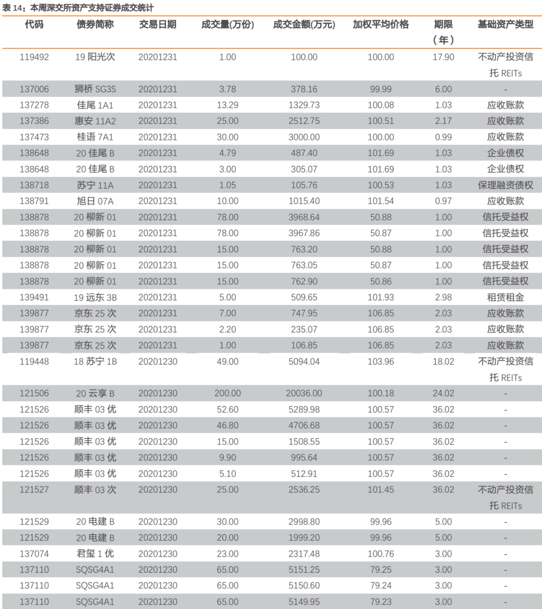 本周深交所资产支持证券成交4244.28万份,成交金额41.32亿元,基础资产包括应收账款、企业债权、保理融资债权、不动产投资信托REITs、小额贷款、信托受益权、租赁租金等。