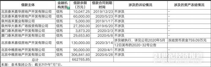 截至2020年7月7日,泰禾集团已到期未付的债务270.65亿元,其中信托借款余额约为66.28亿元。