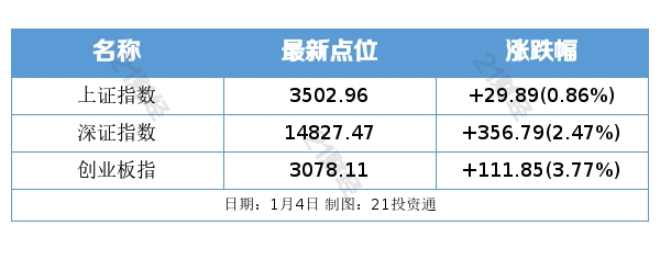 1月4日,A股三大指数均上涨,沪指涨0.86%站上3500点,深证成指涨2.47%,创业板指涨3.77%。两市成交金额超1.1万亿元。农林牧渔、白酒、特斯拉、军工等板块领涨,保险、银行、房地产等板块领跌。