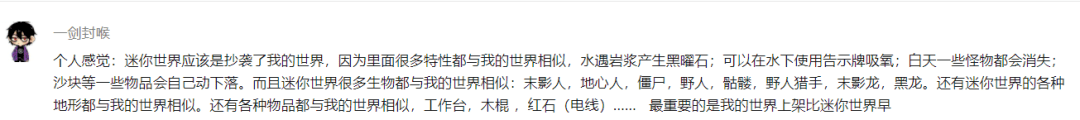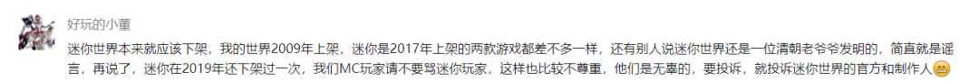自《迷你世界》上线以来就一直因为与《我的世界》高度相似而争议不断,相关内容的评论区充斥着抵制的声音。而《迷你世界》官方从未出面回应,致使出现了一些颠倒是非的言论,认为《迷你世界》并非抄袭。但许多内容只要稍微思考,便会发现其中的观点充满漏洞,而《我的世界》玩家也在后台对这些“有趣的言论”进行了回复,并且表示出自己的观点。