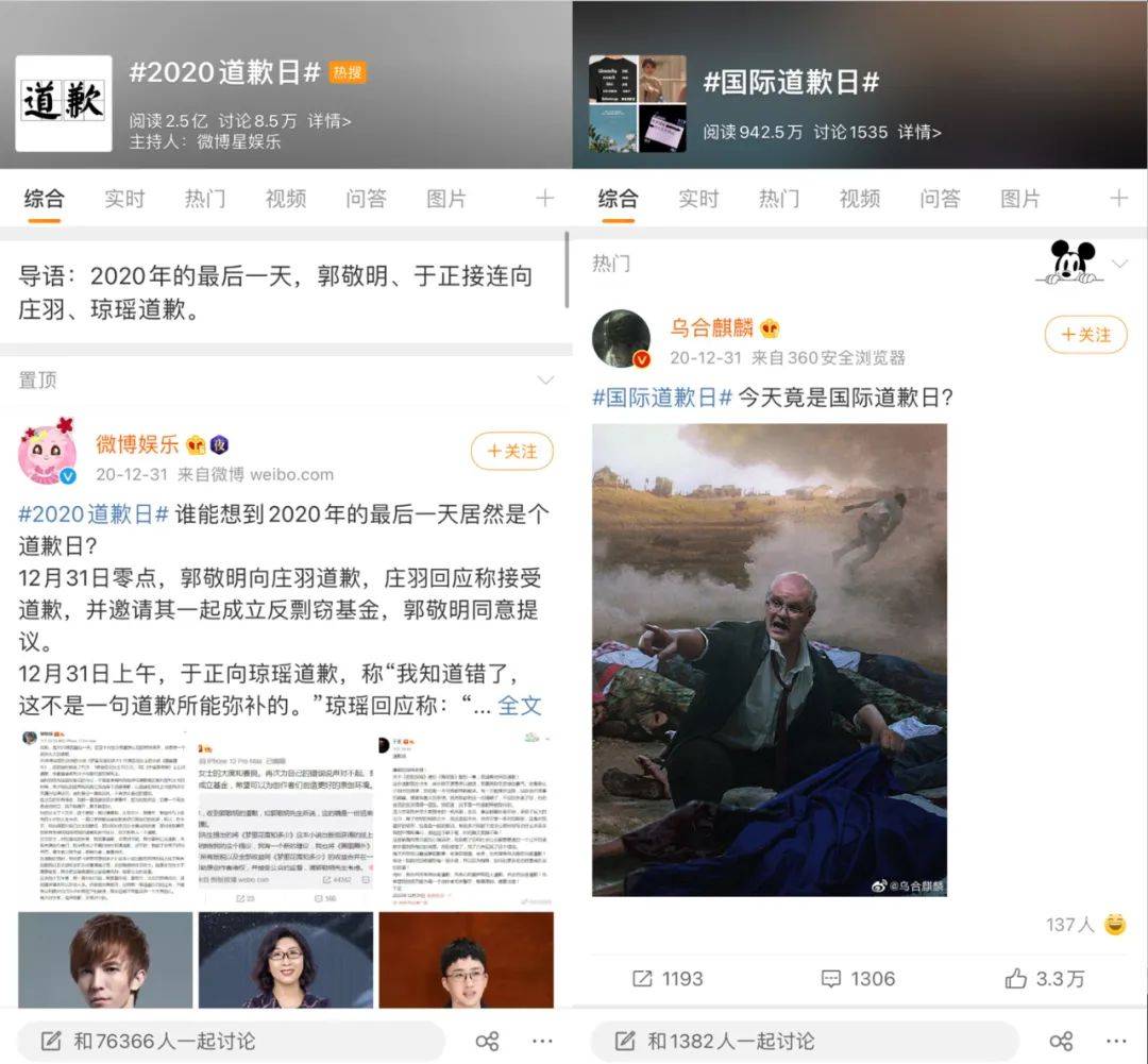 2020年12月31日,郭敬明和于正纷纷在微博上为抄袭行为进行道歉。被网友们戏称为“2020道歉日”“国际道歉日”。但是如果没有之前111位影视从业者联名抵制于正郭敬明,扯下了娱乐圈的遮羞布,或许这场道歉的事情就不会发生。有网友对此事的评价是:当年道歉会影响挣钱,今天不道歉会影响挣钱。