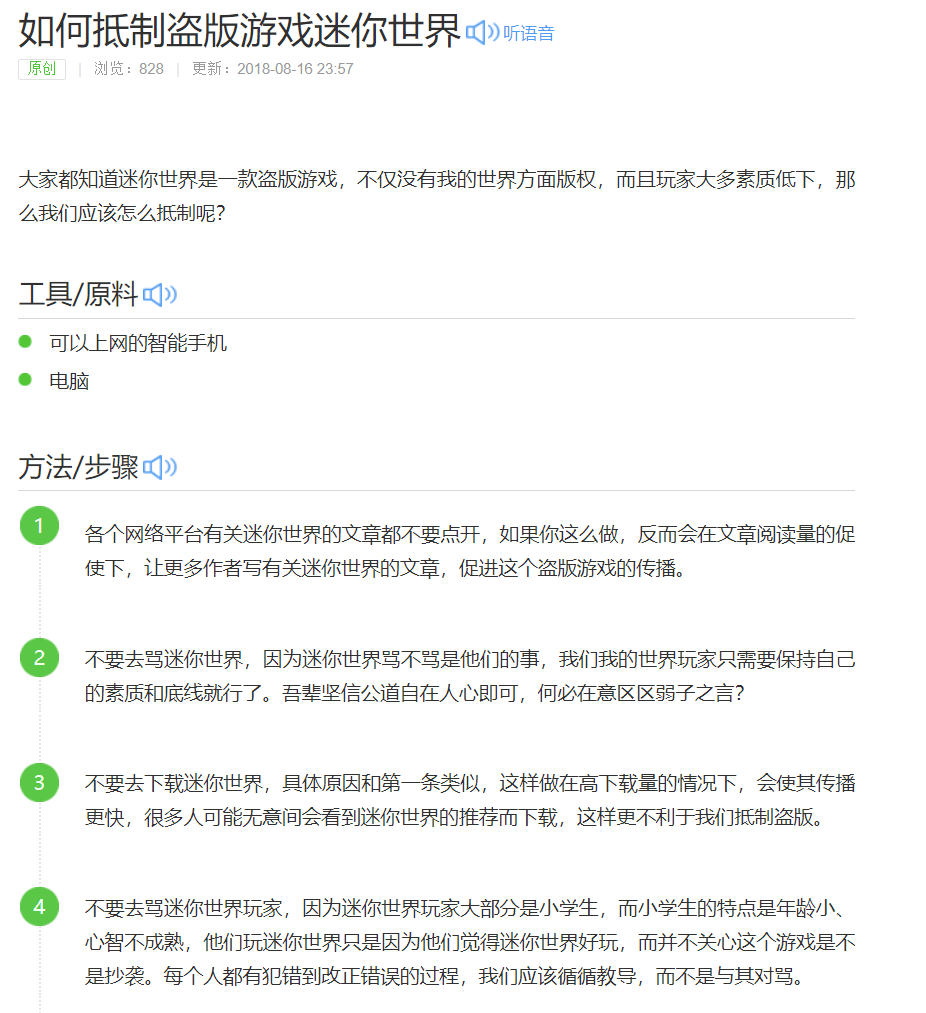 在2020年5月份的时候,《迷你世界》因为不良信息全网下架,我们曾做了一篇报道,谁知道在短短的数日中,该新闻在后台的留言数据近千条,有来自各路玩家的声音。最后,我们整理了其中的留言发现,《我的世界》玩家一致的态度让我们感到吃惊,这群玩家在抵制抄袭游戏的行为极为统一。包括在百度、B站、知乎等多个社区平台上建立起“如何抵制抄袭游戏”“如何抵制盗版游戏”的词条等。