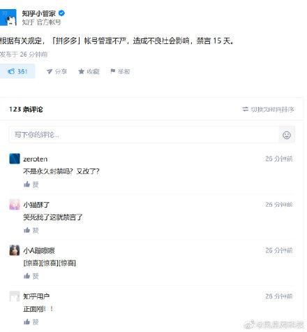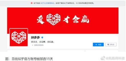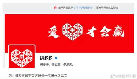 1月5日,知乎网页显示,由于违反知乎社区管理规定,拼多多的知乎官方账号被禁言15天。而根据网友截图显示,该账号一度被永久禁言。