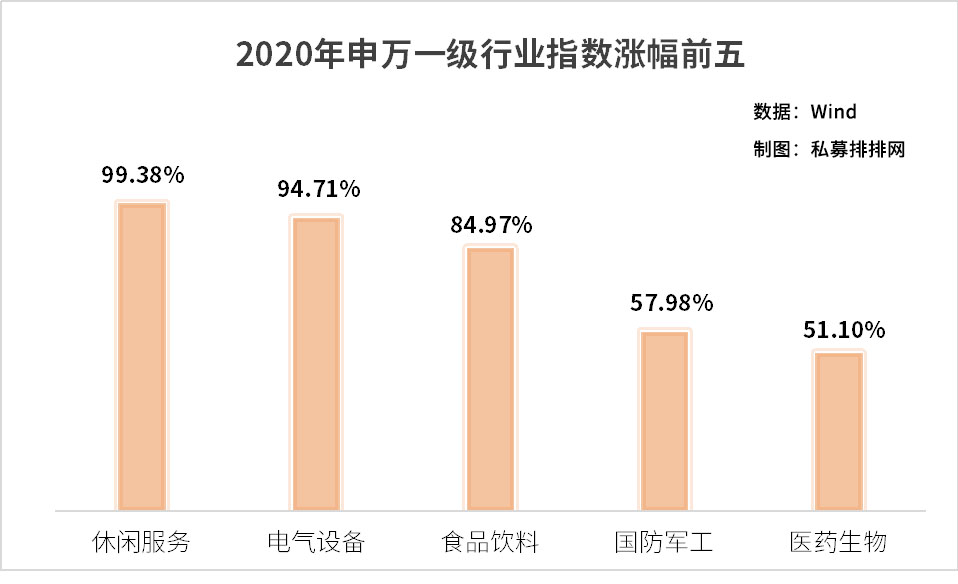 2020年后三季度进入复工复产阶段,A股各大指数均显著回暖。在此期间,受益最大的行业非休闲服务莫属,在一季度申万指数大跌20.01%的前提下,年内总涨幅达99.38%,是后三季度反弹幅度最大的行业。在新能源、特高压、汽车等热门板块的带动下,电气设备行业的涨幅也不遑多让,一季度仅微跌1.51%,年内总涨幅达到94.71%,占据年内涨幅的亚军席位。