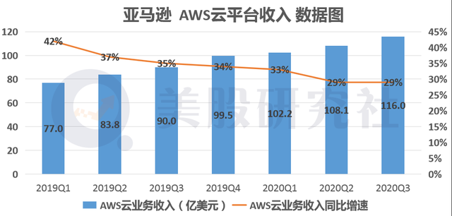 亚马逊的业务拼图还有一块是云计算,其相比于微软、谷歌、IBM等占据着更多的市场份额。今年前三季度,亚马逊AWS分别取得了102亿、108亿和116亿美元的营收规模。AWS的CEO本月表示,今年三季度AWS的年化收入达460亿美元,同比增长29%,相当于一年增长了100亿美元。