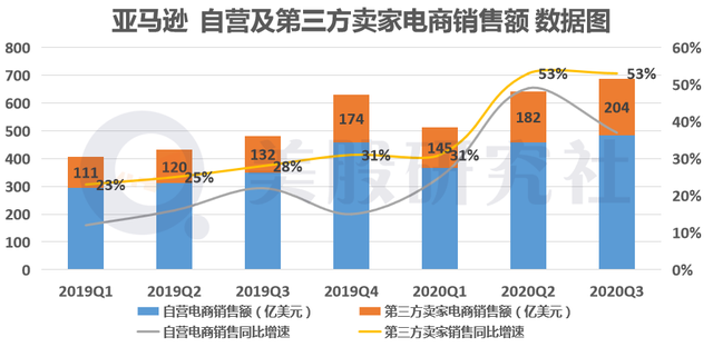 亚马逊的第三方卖家服务收入,从2019年二季度的119.62亿美元逐渐增长至2020年三季度的204.36亿美元,对应的同比增速则从25%一路扩张至53%。亚马逊借助成熟的第三方平台,从商家身上探索出新的增长点。