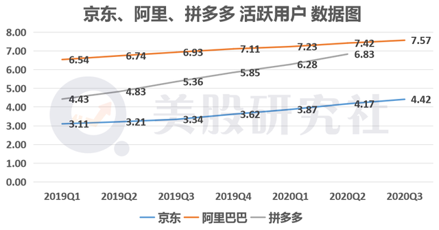 对比于阿里和拼多多,京东在活跃用户这一指标上差距明显。阿里以7.6亿活跃用户位居第一;而拼多多完成对京东的超越,以7.3亿位居第二;京东仅为4.4亿。