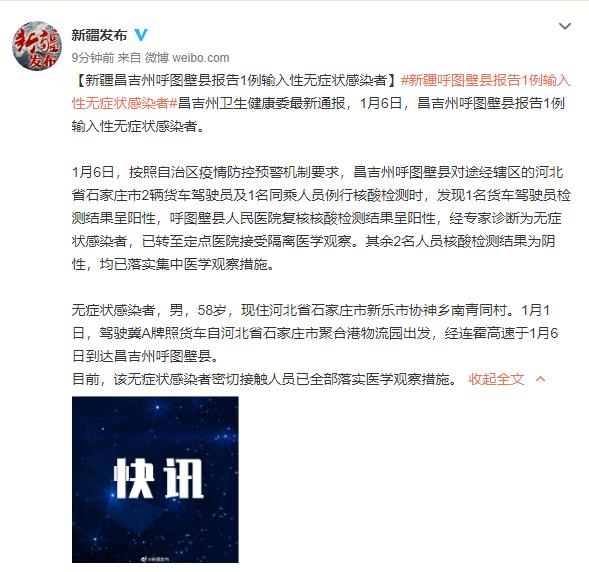 新疆昌吉州卫生健康委最新通报,1月6日,昌吉州呼图壁县报告1例输入性无症状感染者。