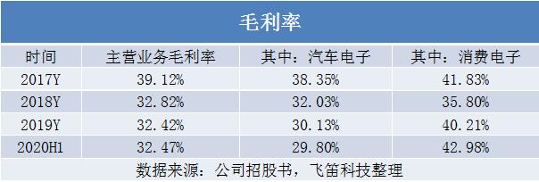 从毛利率来看,报告期内,公司的主营业务毛利率分别为39.12%、32.82%、32.42%和32.47%,公司存在毛利率下降风险,其中2018年下降明显,主要是受汽车电子毛利率下降的影响。