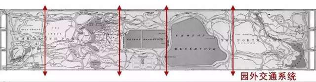 中央公园四周在一百年内围满了街区,一共在横长3.5公里的范围内就有52个街口,纵长不满一公里内有4个街口,总数有112个街口对着公园四周的环行路,这样一个狭长形的公园会引起极大的交通的矛盾。园内仍有专门供骑马的和散步的小路,可以不担心园外汽车的干扰了。