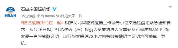 据石家庄国际机场官方微博消息,从1月6日起,各地驻站(场)检疫人员要对进入火车站及石家庄机场出行旅客逐一查验核酸证明,出行旅客须凭72小时内有效核酸阴性证明方可乘车、登机。
