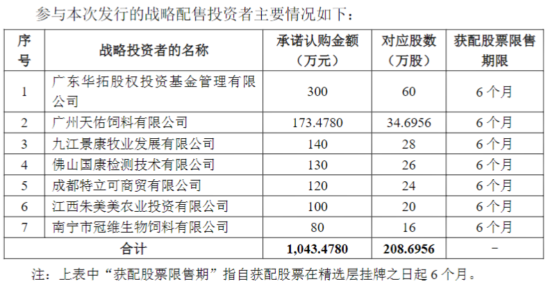 值得注意的是,驱动力吸引到7家战略投资者,分别是广东华拓股权投资基金管理有限公司拟、广州天佑饲料有限公司、广州天佑饲料有限公司、佛山国康检测技术有限公司、成都特立可商贸有限公司、江西朱美美农业投资有限公司、南宁市冠维生物饲料有限公司,发行战略配售发行数量共208.70万股。
