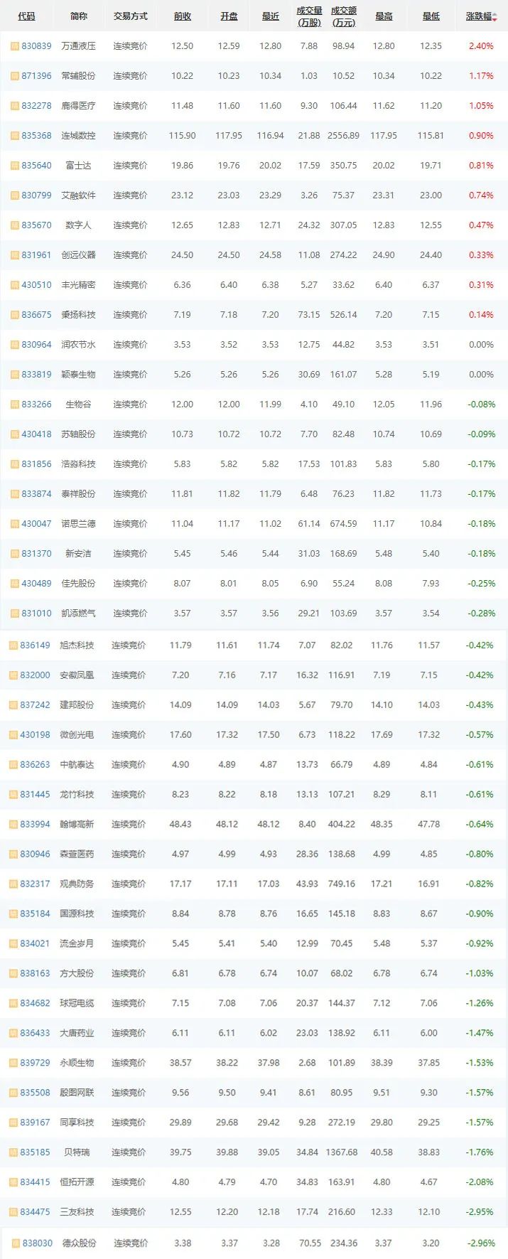1月6日,精选层普跌,10家上涨,2家平盘,29家下跌。其中,万通液压(830839)涨幅居首,上涨2.40%;其次,常辅股份(971396)上涨1.17%;德众股份(838030)下跌2.96%,跌幅居首;三友科技(834475)下跌2.95%居次;润农节水(836675)、颖泰生物(833819)等平盘。