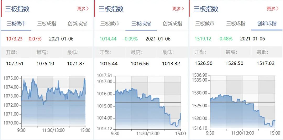 截至1月6日收盘,三板做市报1073.23点,上涨0.07%;三板成指报1014.44点,下跌0.09%;三板创新成指报1519.12点,下跌0.48%。