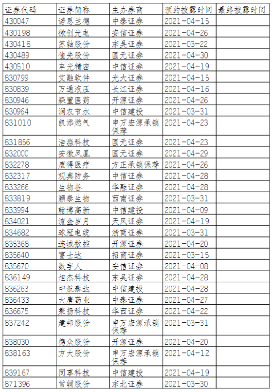1月6日,全国股转更新精选层2020年报预约披露时间表。