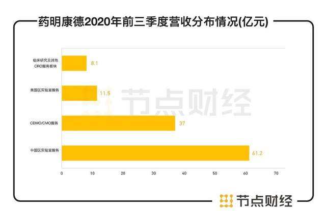 其最新的三季报显示,药明康德2020年前三季度实现营收118.1亿元,同比增长 27.34%。其中,中国区实验室服务收入61.2亿元(51.8%),CDMO/CMO服务收入37亿元(31.3%),美国区实验室服务收入11.5亿元(9.7%),临床研究及其他CRO服务板块收入8.1亿元(6.9%)。