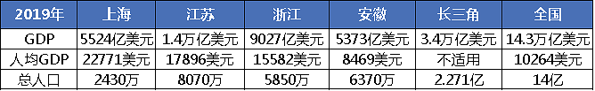 长三角是现代中国发展历史最为悠久、发展程度最高的经济区,也是中国经济发展的重要引擎。2019年,长三角经济区GDP总量达到3.4万亿美元,约占全国四分之一,远超世界第五大经济体印度(2.9万亿美元),仅比欧盟强国德国(3.9万亿美元)少0.5万亿美元。同年,上海、江苏和浙江的人均GDP远高于全国平均水平,上海人均GDP是全国平均水平的两倍多,江苏和浙江的人均GDP分别是全国的1.7倍和1.5倍(数据来源:CEIC EMIS)。