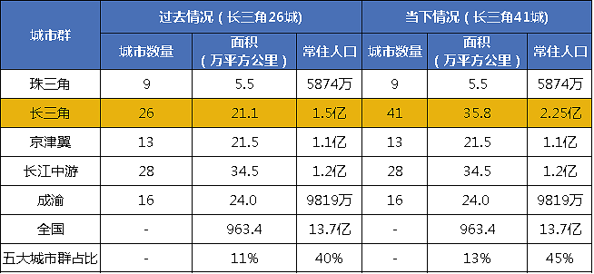 纵观长三角近40年发展历程,国家首次于1982年提出“以上海为中心建立长三角经济圈”,标志着长三角经济区雏形形成;2016年首次将长三角城市群的范围从原来的“两省一市”扩展到目前的“三省一市”;2018年长三角一体化发展上升为国家发展战略;2019年随着《长江三角洲区域一体化发展规划纲要》的正式发布,长三角城市群正式升级为江浙皖三省和上海一市全域41城市,一跃成为国内五大城市群辐射城市数量第一(数据来源:翌弘咨询)。覆盖城市数量的上升也带来了覆盖土地面积和人口数量上的突破。