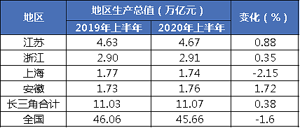 2020年,长三角经济在新冠疫情负面影响下依然保持着强大韧性,并引领了中国疫情后的经济复苏。据国家统计局统计,2020年上半年长三角地区生产总值合计11.07万亿元,占全国GDP的 24.25%,占比同比上升0.3个百分点;地区生产总值同比增长0.38%,高于全国GDP增速 1.25个百分点。除上海外,长三角三个省份GDP增速均为正数,而中国GDP同比下降1.6%。
