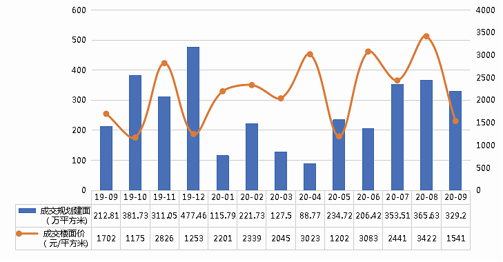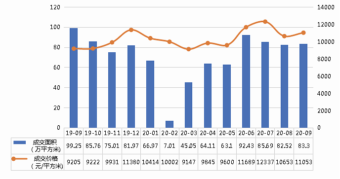 图9: 2019年9月-2020年9月徐州市土地供求价走势