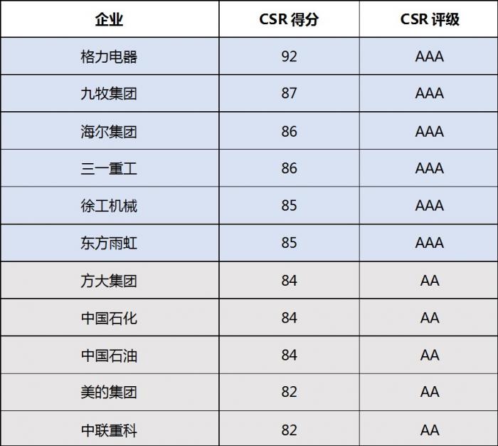 依据CSR总分排名将26家工业制造行业样本企业划分成四个等级,其中前5名为AAA级,依次是:格力电器、九牧集团、海尔集团、三一重工、徐州机械、东方雨虹(其中徐州器械与东方雨虹并列第五名);7-10名为AA级,依次是:方大集团、中国石化、中国石油、美的集团、中联重科(其中美的集团与中联重科并列第十名)。