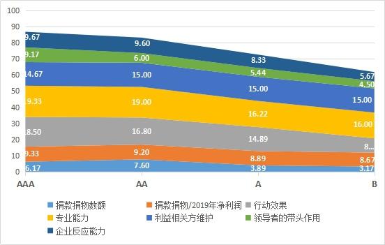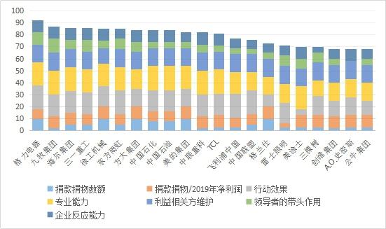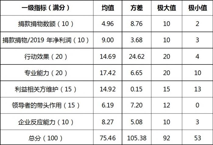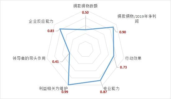 结合雷达图来看,行业整体在领导者的带头作用和绝对捐赠数额方面的表现略有欠缺,尤其在领导者的带头作用一项上,26家企业平均得分仅为该项满分的41%,行业整体的水平有待提高。