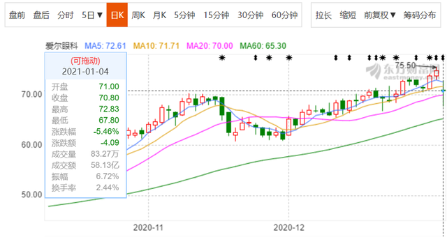 1月4日开盘,大A股一片欣欣向荣,但爱尔眼科大幅低开超9个点,而后跌幅虽收窄至5个点以内,但午后再度下挫,盘中最低掉至67.41元/股。