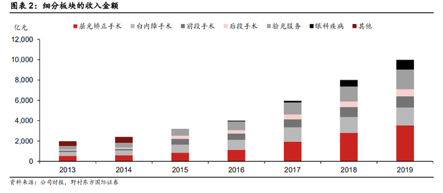 眼前段手术、眼后段手术、其他项目合计占比三成左右。也就是说,爱尔眼科几乎全部收入都来自眼科诊疗方面的服务,主营业务非常突出。