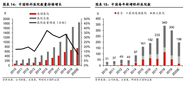 不过,基于广阔的市场前景,目前这一赛道已越来越拥挤。过去五年间,我国眼科医院、诊所以25.7%的复合增长率增长,截至2020年11月达到1655家,新增数量中大部分为民营医疗机构。