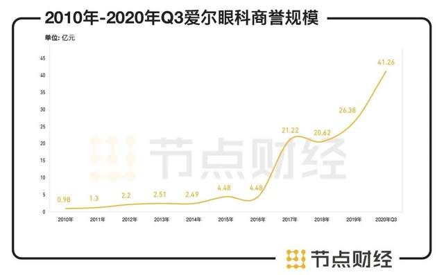 分析爱尔眼科历史上的医院收购案例,其收购医院的PE平均为23倍,截至2020年三季度,累计的商誉已超过41亿元,占总资产的比例为24.96%,在同行业中处于很高水平。