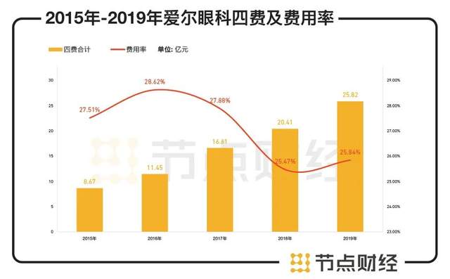 费用端,包括管理费用、销售费用、财务费用和销售费用在内,爱尔眼科2015-2019年四费总计为8.67亿元、11.45亿元、16.61亿元、20.41亿元和25.82亿元,费用率在25%-28%之间,整体为下降态势,显示费用管控能力在加强。
