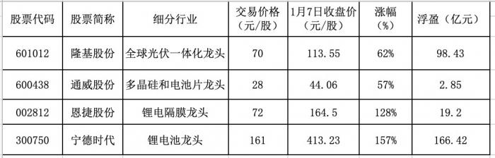 在新能源电池方面,高瓴资本去年7月斥资百亿元投资了锂电池龙头企业宁德时代。9月,以每股72元总价15亿元认购了电池隔膜巨头恩捷股份。截至1月7日,这些个股都迎来了大幅上涨,高瓴资本在新能源赛道的累积浮盈已高达287亿元。