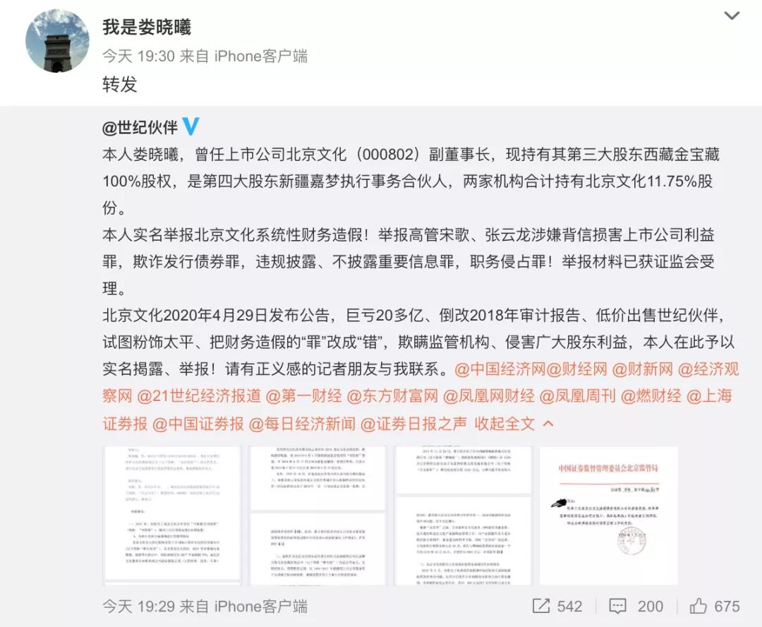 娄晓曦称,北京文化2020年4月29日发布公告,巨亏20多亿、倒改2018年审计报告、低价出售世纪伙伴,试图粉饰太平、把财务造假的“罪”改成“错”,欺瞒监管机构、侵害广大股东利益。