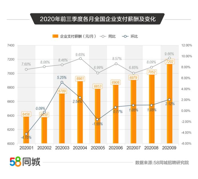 从蓝领的薪资水平来看,2020年前三季度全国企业支付月薪为6948元,相比去年同期增长9.28%。从2月开始,随着复工复产推进,企业招聘需求增长,劳动者工作时间逐渐恢复正常,因此企业支付薪酬也呈现出逐步上升趋势,从2月的6450元,上升到9月的7202元,增幅达到11.66%。