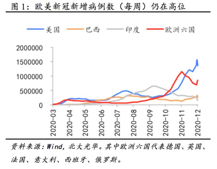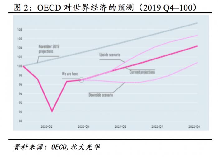 世界经济短期内仍将承压。新冠肺炎疫情是导致2020年世界经济受到严重冲击的主要原因。秋冬季节世界多国疫情再次爆发,欧美国家新增确诊人数仍然处于高位(见图1),中短期来看疫情仍将令全球经济在一定程度上承压。纵然全球新冠疫苗(以BioNtech-辉瑞、Moderna、AZ等为代表)三期临床结果顺利,疫苗接种渐行渐近,2021年世界经济将走出衰退,普遍出现恢复性增长,但GDP增速低于假设未发生疫情的正常经济增长水平(见图2)。