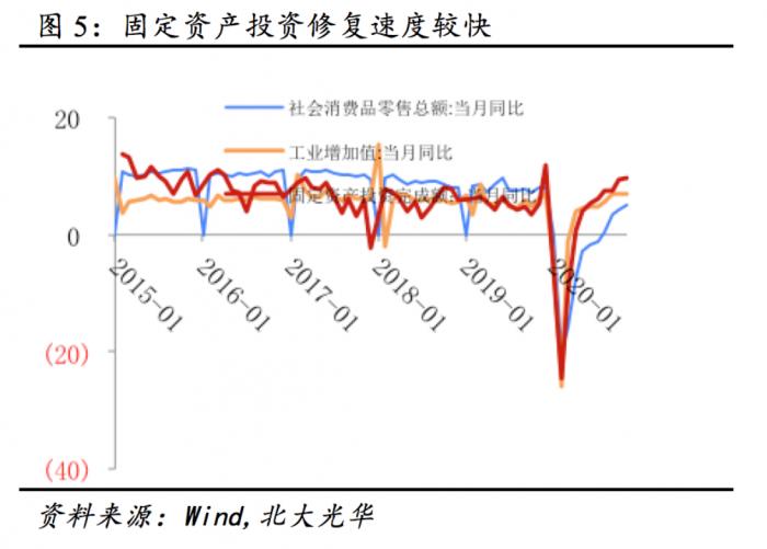 得益于精准及时的政策支持,2020年我国经济实现V型反转,三季度GDP累计增速扭负转正(图4)。但当前经济恢复基础仍不牢固,为经济增长提供支撑的房地产投资、基建投资与进出口今年面临地产调控政策、财政压力与国外需求的不确定性,消费恢复较为滞后,内需提振尚需时日(图5)。由于去年的低基数效应,今年一季度经济增速或将跳至高位,但不应因此对形势过于乐观,随着经济修复动能逐渐减弱,尤其今年下半年经济回归正常轨道之后,经济增长可能因动力不足而再次面临较大压力。