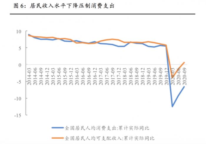 居民收入下降压制消费支出,内需提振仍需时间。2020年疫情导致居民收入增速显著放缓,从而造成了预防性储蓄的增高和边际消费倾向下降,压制了消费的复苏速度(图6)。餐饮与石油为主要拖累,汽车为主要支撑。疫后居民外出就餐意愿有所降低,餐饮收入恢复速度较慢;国外低油价与出行活动限制导致的需求减少使得今年石油消费一直呈两位数负增长。