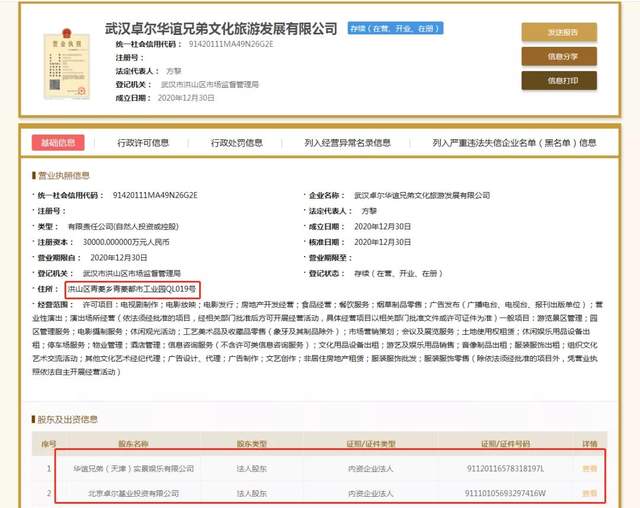 而在年关将至之际,该项目的操盘主体终于落定。企查查信息显示,2020年12月30日,一家名为武汉卓尔华谊兄弟文化旅游发展有限公司成立,该公司注册资本为30000万元人民币,由卓尔控股和华谊兄弟分别占股90%和10%。