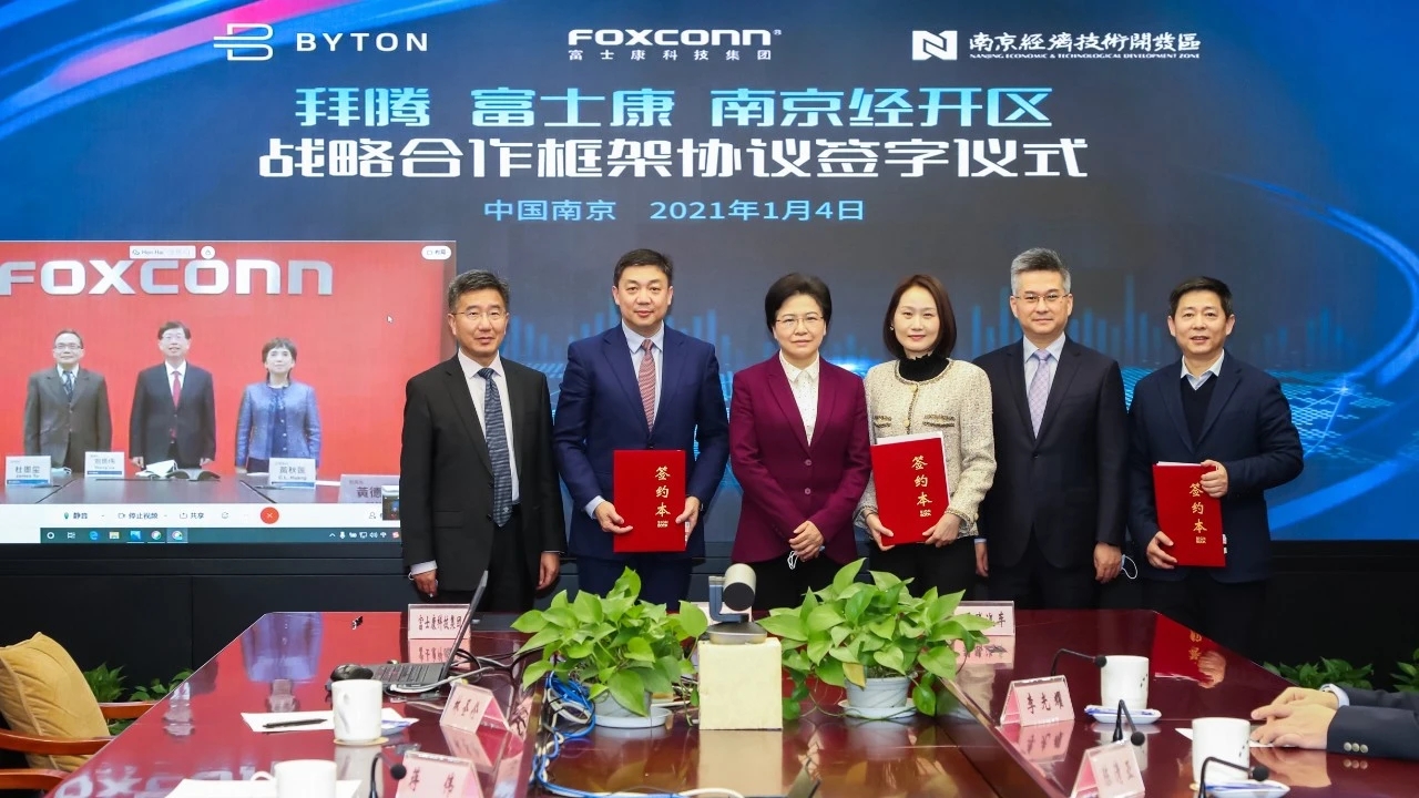 1月4日,拜腾汽车与富士康科技集团、南京经济技术开发区签署战略合作框架协议,合力加速推进拜腾首款车型M-Byte的制造工作,争取2022年第一季度前实现量产。