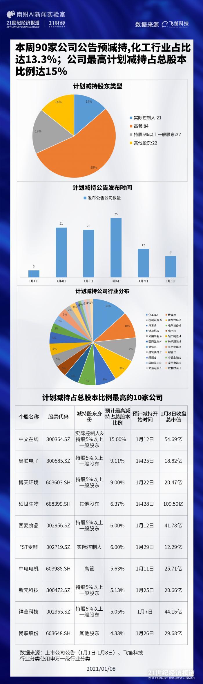 据飞笛科技统计,1月1日-1月8日期间,共有90家上市公司披露了计划减持的公告,较上周数量上升55家。涉及计划减持对象154个,其中有15家公司的实控人参与计划减持,占比16.6%,比例较上周有所上升。中文在线(300364.SZ)的实控人计划减持比例最高,减持最高占比将达到公司总股本的15%。