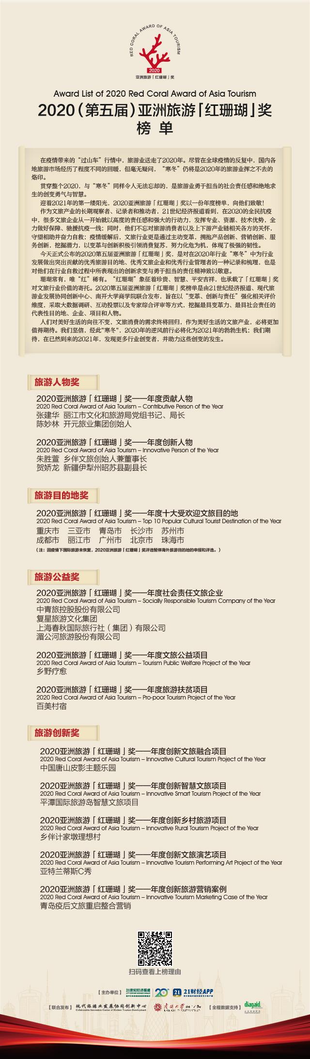 2020(第五届)“亚洲旅游「红珊瑚」奖”榜单,由21世纪经济报道、现代旅游业发展协同创新中心、南开大学商学院联合发布。为了体现特殊时期的价值追求,本届榜单旨在以“变革、创新与责任”强化相关评价维度,采取大数据调研、互动投票以及专家综合评审等方式,挖掘最具变革力、最具社会责任的代表性目的地、企业、项目和人物,为行业树立价值标杆、发掘创新样本、传播榜样力量,向那些为全社会抗疫行动、为全行业复苏发展作出突出贡献的企业和人物致敬。