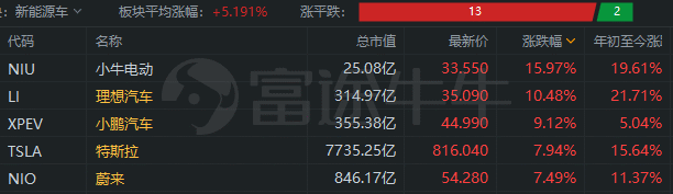 新能源车齐涨,理想涨超10%领升三剑客,小牛电动大涨近20%