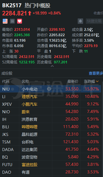 知名中概股中,阿里巴巴跌0.31%;百度涨1.92%;网易涨7.99%;拼多多涨1.91%;蔚来涨7.49%;小鹏汽车涨9.12%;理想汽车涨10.48%;迅雷涨48.07%;哔哩哔哩涨5.49%创新高。