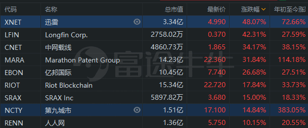 小牛电动大涨近20%;比特币又创新高,区块链股暴涨,迅雷涨超48%;吉利汽车ADR涨7.55%、比亚迪粉单涨超6%,均创新高。