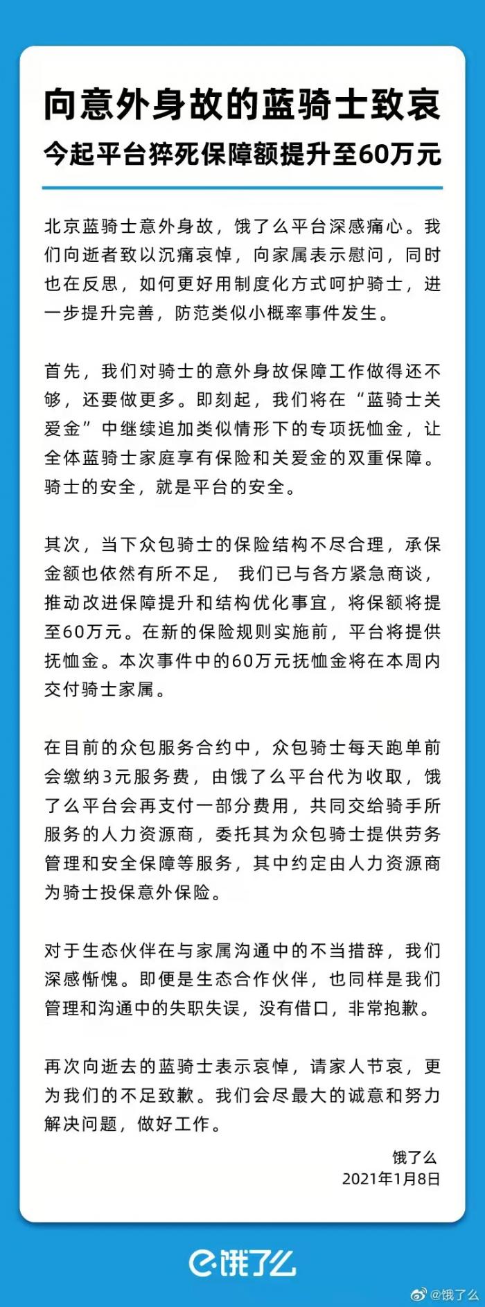饿了么再次回应骑手猝死:保障额提升至60万元