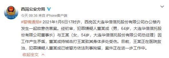 据西岗公安分局微博消息,2021年1月6日17时许,西岗区大连华信信托股份有限公司办公楼内发生一起故意伤害案。经初审,犯罪嫌疑人董某成(男,64岁,大连华信信托股份有限公司董事长)与王某(女,54岁,大连华信信托股份有限公司总经理)因工作产生矛盾,董某成持械击打王某致其身体多处受伤。目前,王某正在医院救治,犯罪嫌疑人董某成已被警方依法刑事拘留,案件正在进一步工作中。