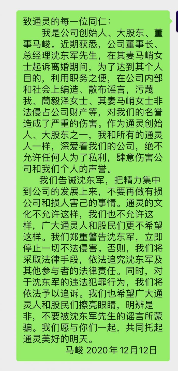 针对被“公司举报的关于涉嫌职务侵占”,马峻告诉21世纪经济报道记者,沈东军在2020年12月14日发了一封给莱绅通灵员工的公开信,“我才知道我们被沈东军举报了。”
