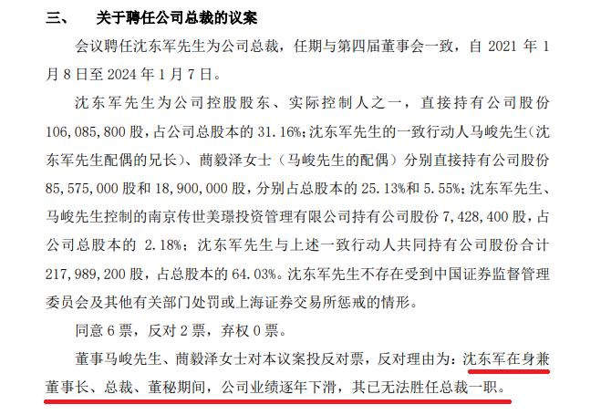 与此同时,莱绅通灵新董事会还选举了沈东军为公司总裁,而马峻与蔄毅泽投了反对票,理由是“沈东军在身兼董事长、总裁、董秘期间,公司业绩逐年下滑,其已无法胜任总裁一职。”