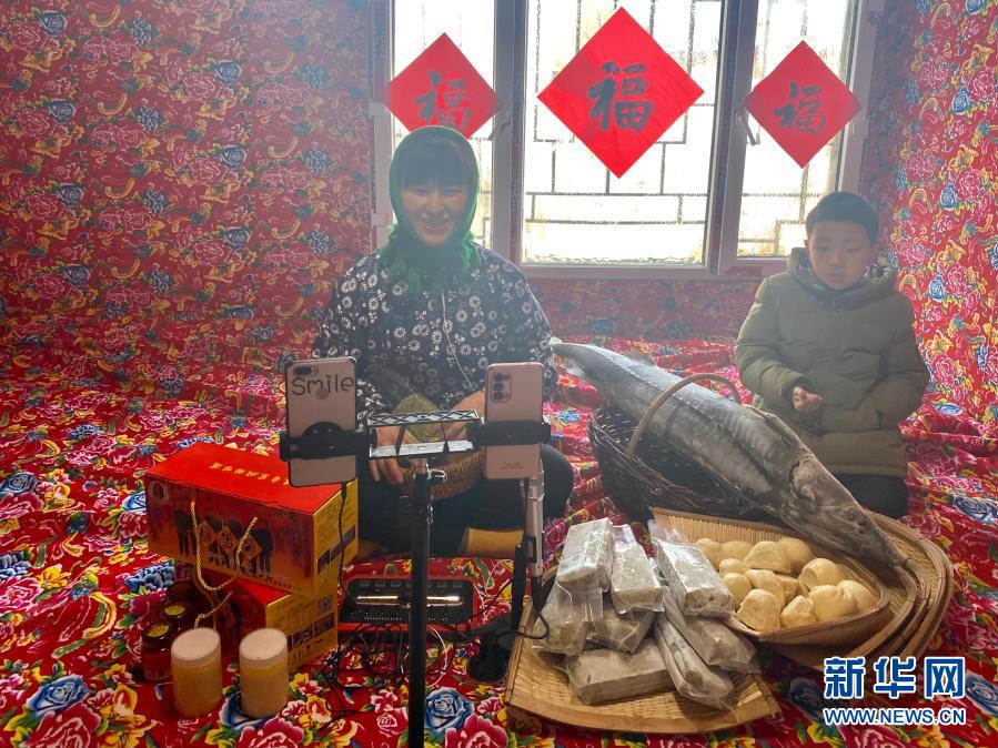 在黑龙江省双鸭山市饶河县西林子乡小南河村,小剧团团长刘伶俐在游客服务中心直播带货(2020年12月31日摄)。新华社记者杨思琪摄